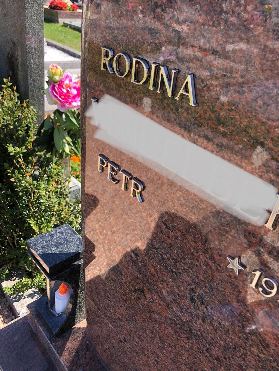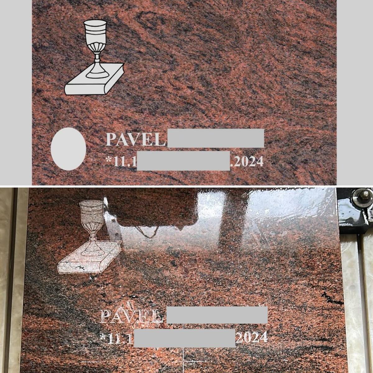 : Původní nápisová deska z mramoru byla již značně poškozená a tak jsme zákazníkovi navrhli řešení – vyrobili jsme novou žulovou desku (odstín Impala), která byla umístěna na desku stávající.